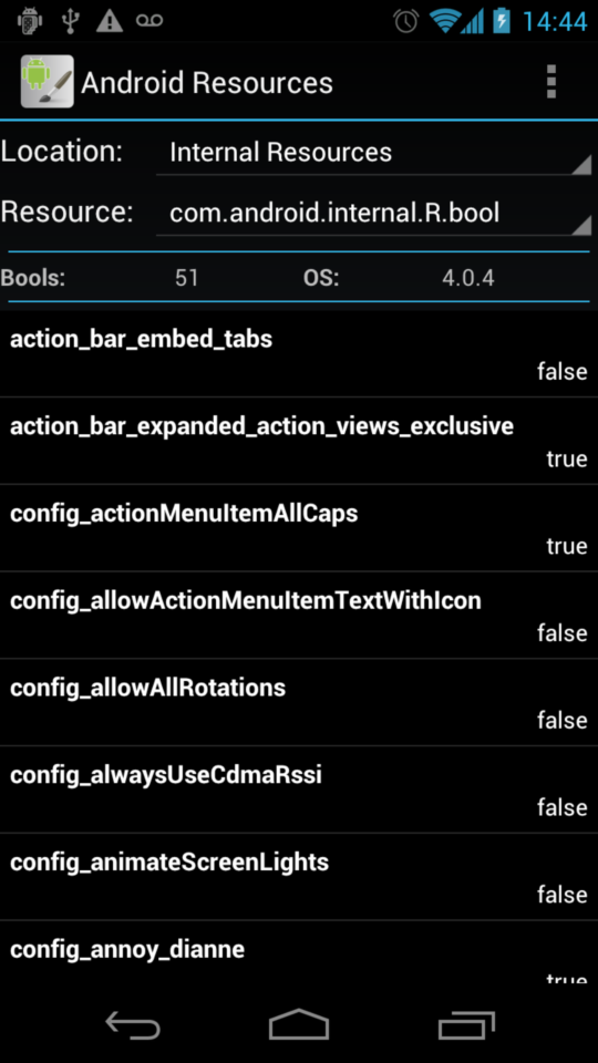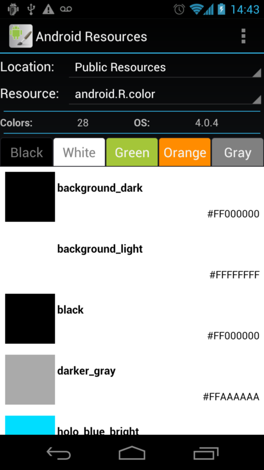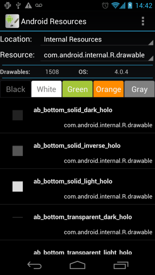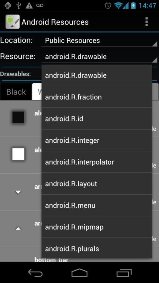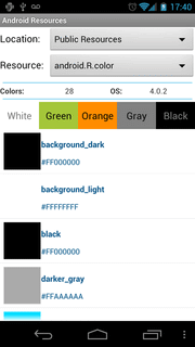 This application will list all public and private Android resources (i.e. resources located under android.R.* and under com.android.internal.R.*) for the current device.