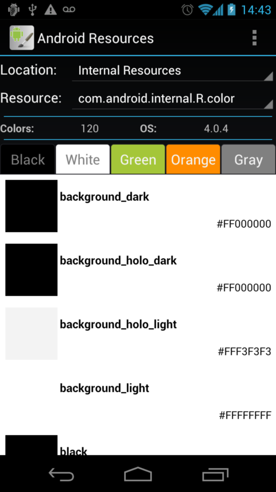 If the resource is a drawable or a colour the background colour of the list can be changed to see how it looks next to a different colour.