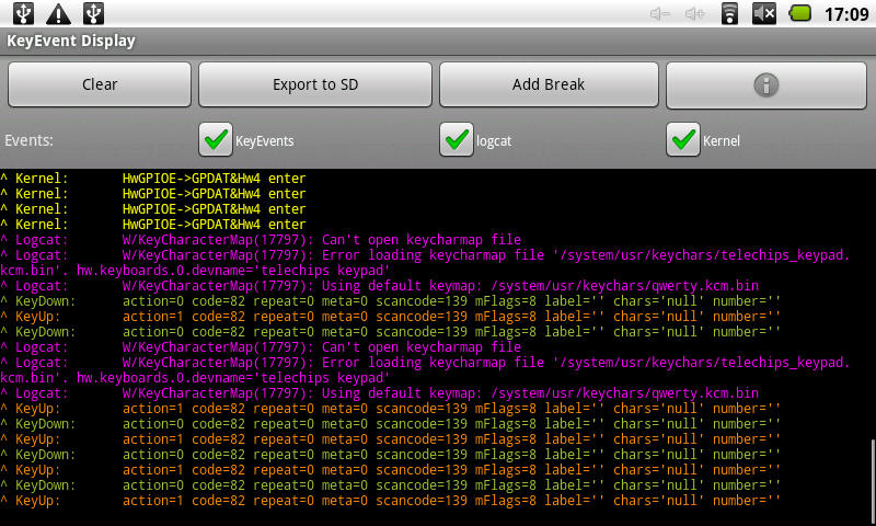 - LogCat: Will display any messages KeyCharacterMap writes reports in Logcat.